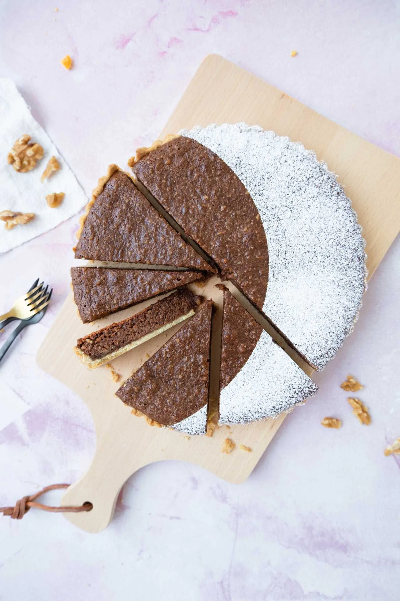 Een chocolade walnotentaart, ik wil er niet over stoefen, maar ik doe het toch: wat een combinatie! Eerlijk? Normaal ben ik niet zo voor chocoladetaart. Ik vind het wat saai… Maar deze chocolade walnotentaart kan je onmogelijk saai vinden.